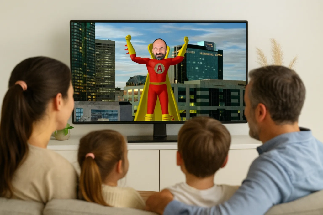 In this personalised Father’s Day cartoon, “Super Dad” takes the lead role in an exciting action story. He becomes Earth’s defender, fighting against the villainous Professor Evil and his dangerous plans.