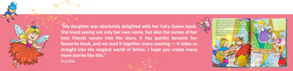 Absolument enchantée par ‘La Reine des Fées’ ! Ce livre est un véritable trésor avec une personnalisation exceptionnelle. Non seulement le prénom de notre enfant, mais aussi son âge, notre ville et même les prénoms de ses amis sont intégrés dans l’histoire. Les nombreux éléments personnalisés rendent l’aventure vraiment unique et spéciale. Un cadeau inoubliable qui a fait briller les yeux de notre petite fée !”