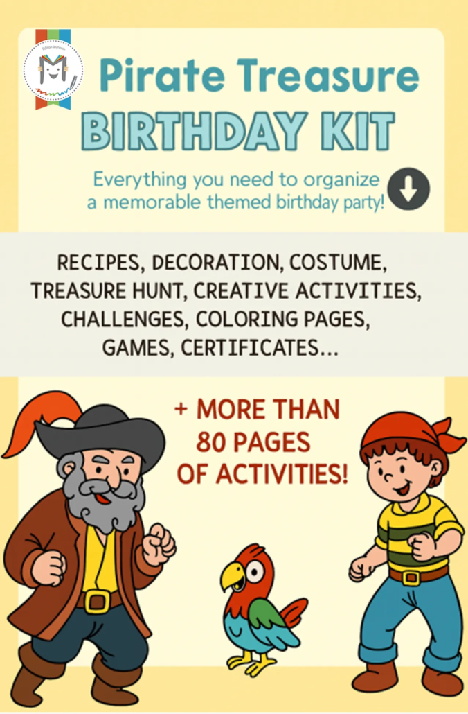 Our Pirate-themed birthday party printable kit gives you a complete, all-in-one solution to host the perfect pirate adventure. Decorations, activities, games, everything is ready to download and enjoy!